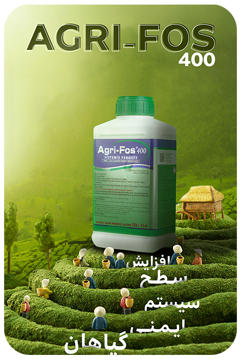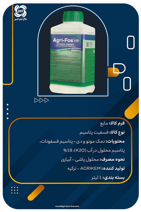 حاوی ۴۰۰ گرم بر لیتر نمک مونو و دی- پتاسیم فسفونات می باشد. این محصول نسل جدیدی از ترکیبات فسفیت می باشد که بر پایه فسفیت پتاسیم غیر سمی فرموله شده است. Agri-fos دارای عملکرد سیستمیک در گیاهان بوده و می تواند از طریق هر دو سیستم آوندی آبکش و چوب در گیاه حرکت نماید. این محصول دارای فرمولاسیونی با pH بافری ۶/۵ می باشد. این محصول بدلیل غیر سمی بودن نسبت به فسفیتهای پتاسیم موجود در بازار دارای ارجحیت می باشد.