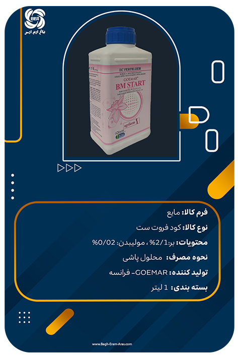 BM START ترکیبی خاص و متعادل جهت بهبود و افزایش کیفیت گلدهی و تولید میوه می باشد. استفاده از این محصول موجب تحریک گیاهان به سنتز هورمونهای گلدهی و بهبود روند تشکیل میوه، تسریع رشد میوه ها و افزایش اندازه آنها می شود. همچنین باعث افزایش میزان یکدستی و هم اندازه شدن میوه ها در زمان برداشت می شود. BM START را میتوان به تنهایی و یا بصورت مخلوط با سموم آفتکش عمومی و سایر کودها مورد استفاده قرار داد. در زمان اختلاط این محصول در داخل تانک سمپاش باید دقت نمود که BM START در آخر به تانک سمپاش اضافه شود. این محصول را می توان به سادگی در باغات میوه و انگور و همچنین در کشتهای صیفی مورد استفاده قرار داد. مصرف BM START در زمان تشکیل میوه ها باعث یکدستی اندازه و همچنین همرسی میوه ها در زمان برداشت می شود که کمک بزرگی به کشاورزان در برداشت بیشتر میوه ها در یک زمان می نماید.