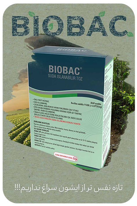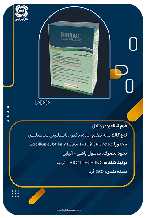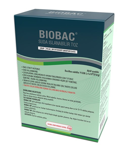 محصولBiobac حاوی Bacillus subtilis (۱×۱۰۹ CFU/ g) بصورت پودر خیس شونده می باشد. سویه Y1336 این باکتری از خاکهای تایوان جداسازی شده است که سرعت تکثیر بالایی دارد. انواع مختلفی از این گونه باکتری وجود دارد که Y1336 Bacillus subtilis بر روی قارچها و باکتریها بخصوص قارچ عامل کپک خاکستری، سفیدک پودری و قارچهای عامل پوسیدگی ریشه موثر می باشد.